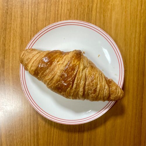おつかれさまです。 今日の朝ごパンは… 「箱根ベーカリー」の人気ナンバー1 『箱根贅沢PREMIUMクロワッサン』 これ、お皿が小さいのではありません。 クロワッサンが大きいのです。 他のパン屋のクロワッサンに比べて、ひとまわり、いや、ふたまわり、デカい…