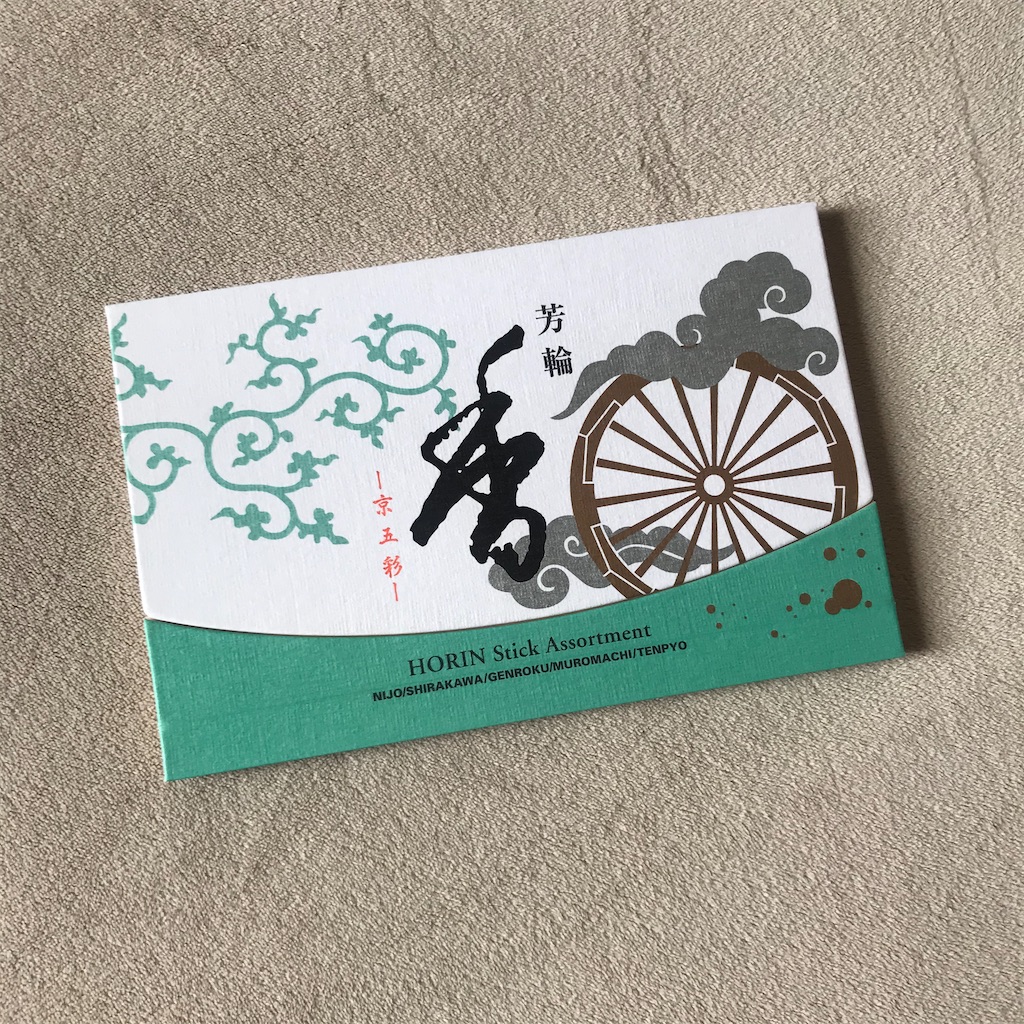 300年ほど前に創業した歴史ある老舗お香メーカー松栄堂の『芳輪 京五彩』には、「二条」「白川」「元禄」「室町」「天平」、5種類のお香が各4本入っています。