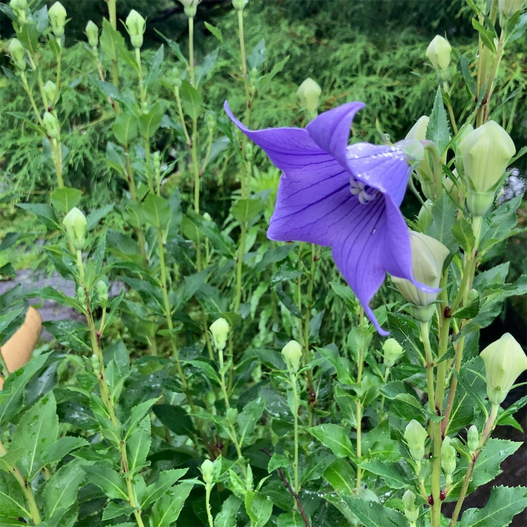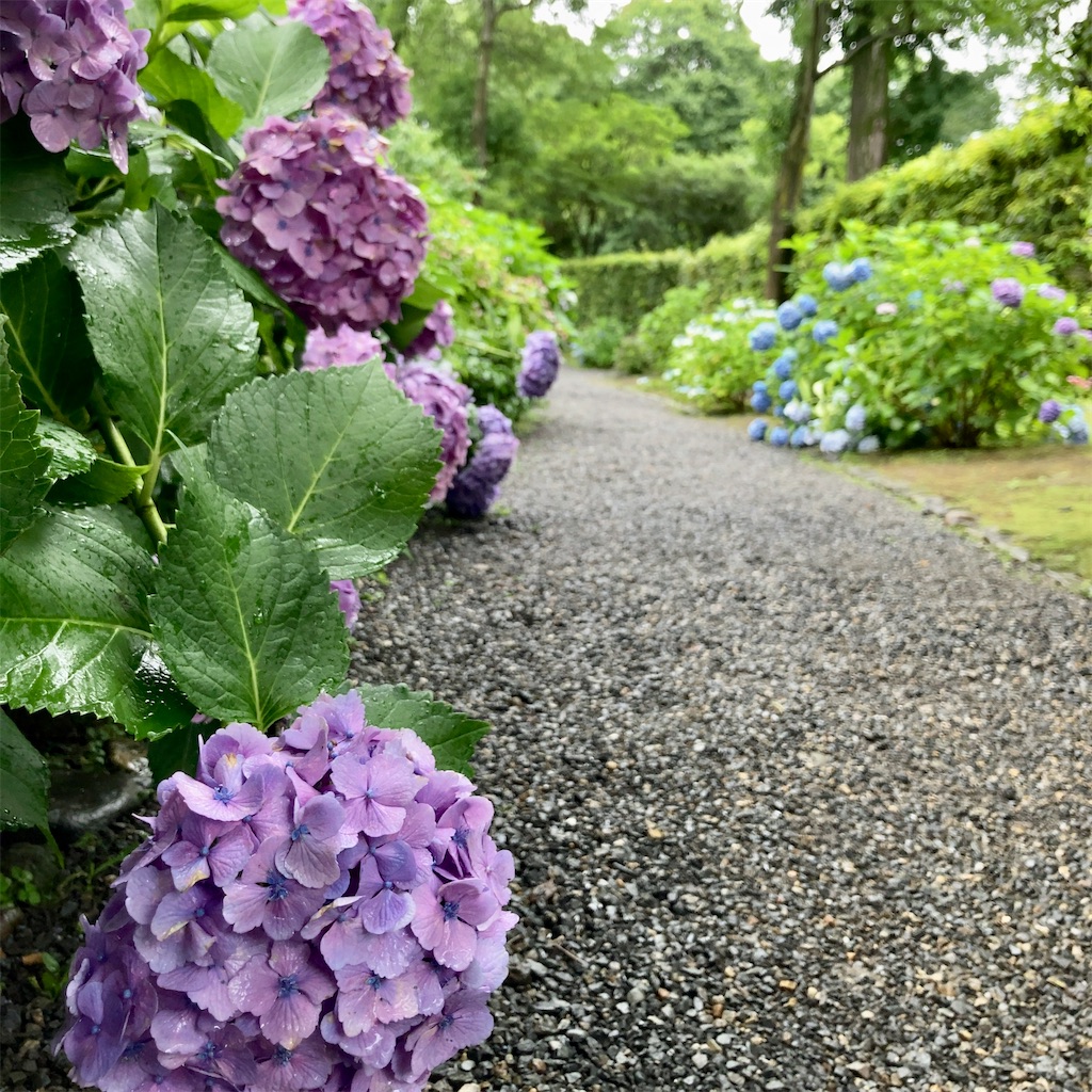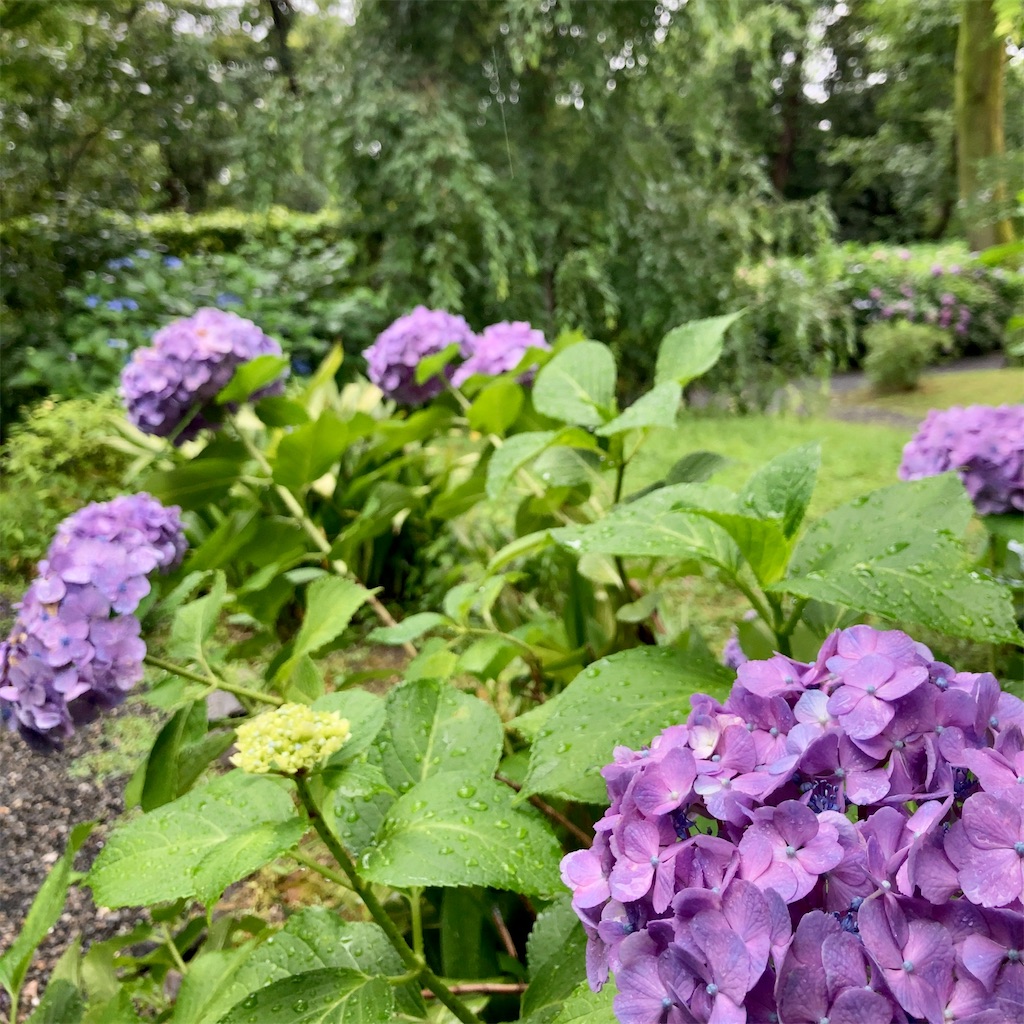 「旧三井家下鴨別邸」のお庭では、6月下旬になると、終わりかけの紫陽花と咲き始めの桔梗が同時に楽しめます。