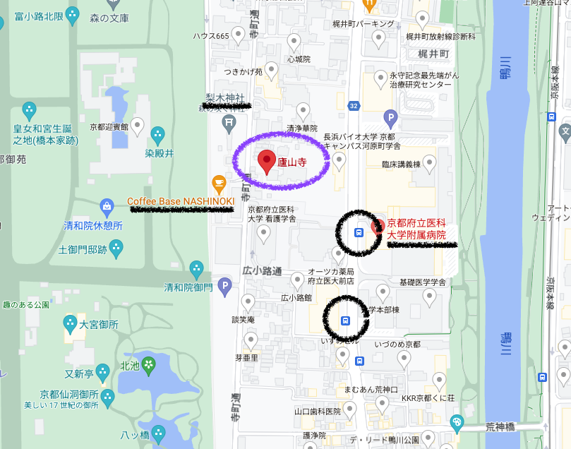 最寄りのバス停:府立医大病院前(徒歩5分くらい)