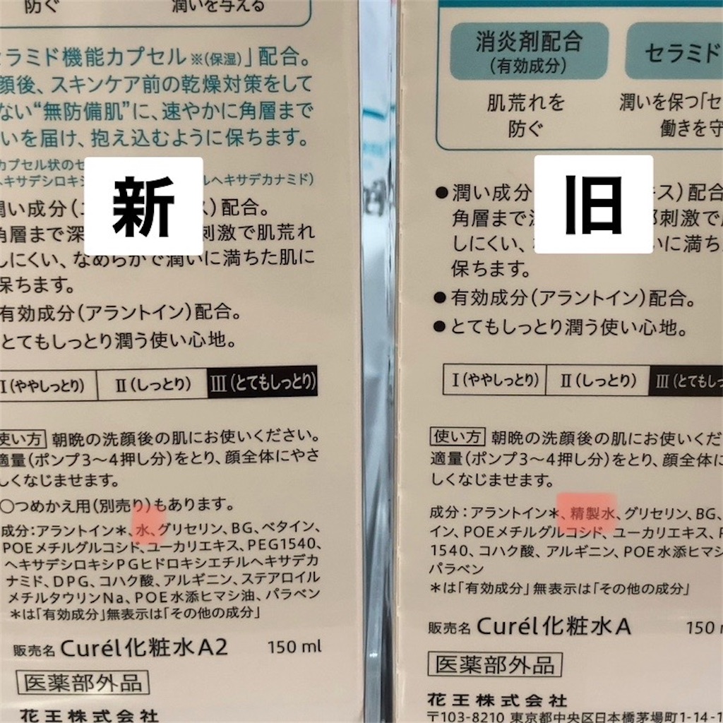 しかし、新『潤浸保湿化粧水』のベースが精製水→水に変更されています。